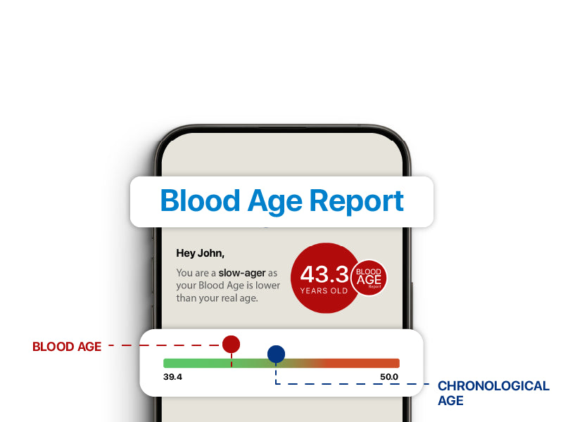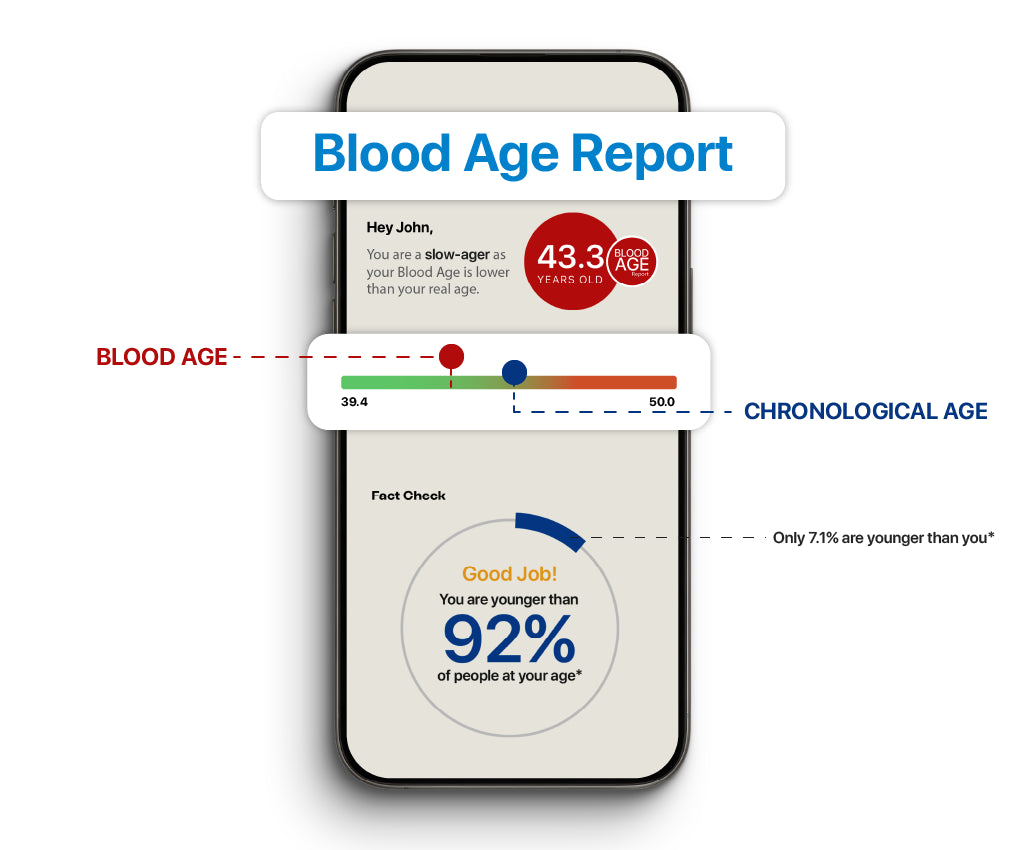The test leverages clinical blood reports and analyses 40+ biomarkers to provide blood age predictions. It uses advanced algorithms trained on vast datasets to interpret your blood biomarkers and offers an actionable plan for lifestyle and healthcare decisions.